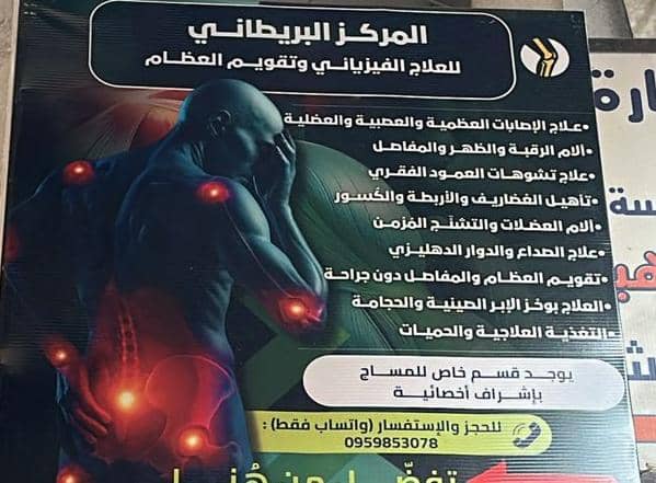 المركز البريطاني للعلاج الطبيعي في دمشق هو مركز متخصص في العلاج الفيزيائي وإعادة التأهيل، نقدم حلولًا فعالة لتخفيف الألم وتحسين الحركة باستخدام فريق طبي متخخص يملك أحدث الأجهزة والتقنيات . هدفنا هو مساعدتك على استعادة نشاطك اليومي بصحة وحيوية بإذن الله . للحجز والاستشارة على الرقم: 00963959853078.